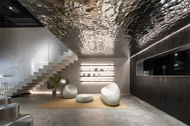 “水波纹板”顾名思义就是表面纹理类似水波荡漾,装饰性极强一种板材。作为吊顶等区域的点缀装饰,不锈钢的特殊材质使得空间从视觉上层次更丰富。