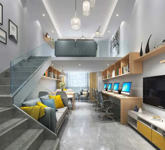 设计装饰成公寓式办公室的大多是商住楼和办公公寓建筑,区别公寓式办公室最大的特点就是除了日常办公,其间还兼具有盥洗、寝室、日常生活等功能,即白天办公,晚上休息的办公住房一体的双重功能空间。
